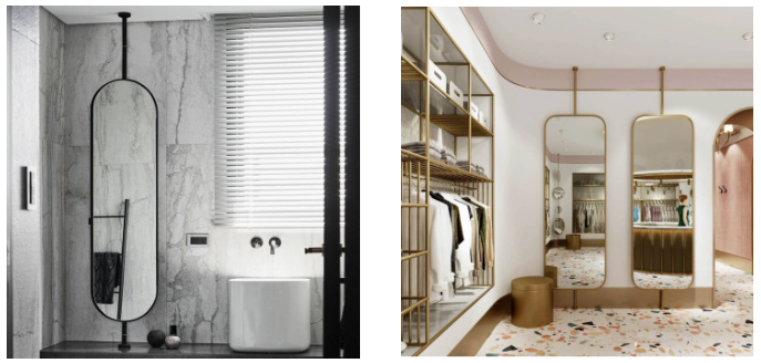 - Зеркала с телескопической штангой — регулируемые по высоте модели, которые можно индивидуально подстраивать под рост или необходимость использования. Особенно востребованы зеркала в металлической раме.